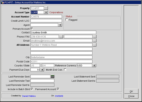 Note: Default account types can be specified for each type of profile using the following AR application parameter settings: Default Travel Agent Account Type (for Travel Agent accounts), Default Group Account Type (for Group accounts), Default Company Account Type (for Company accounts), and Default Individual Account Type (for individual guest accounts). For example, when creating a new account for a Company profile type, the account type defaults to the type defined by Default Company Account Type.