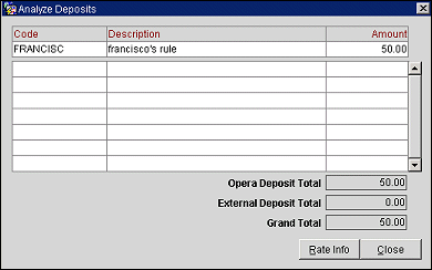 The Analyze Deposits screen displays more detailed deposit information related to the reservation. Select the Analyze Deposit button from the Deposit Cancellation screen/Deposit tab to access this screen. This button is available when the OPX_CONC2 OPERA Gateway for Concepts EAS XML and OPR_<version number>ORS license codes are active.
