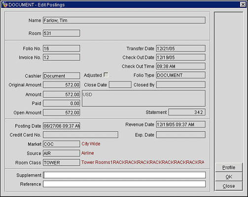 Note: Cutover balances and payments entered through Configuration > AR > Old Balances will show the market code, source code, and room class specified at the time the cutover balance or payment was entered.