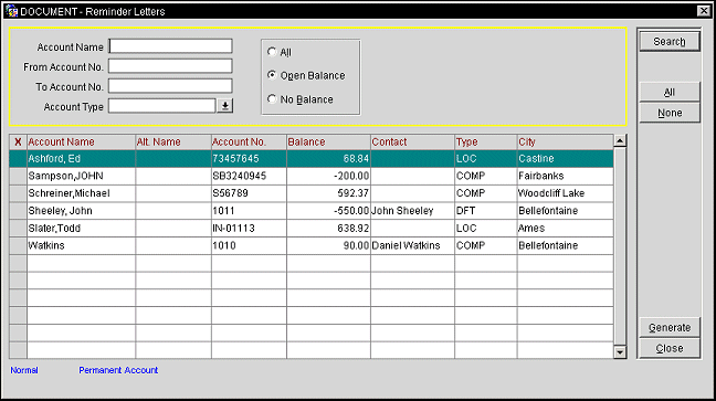 Using the search results grid, select the account or accounts to generate reminder letters by placing an X in the X column. Click in the X column to select the account. Or you can select the account by highlighting it and pressing the spacebar. If you are choosing only one account for the function, you can simply highlight the account without placing an X in this column. When you have selected the account or accounts to generate reminder letters, select the Generate button.