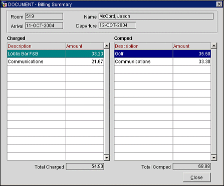 The Billing Summary feature allows casino hosts to review and compare a side-by-side summary of the charged and comped components of guest transactions.