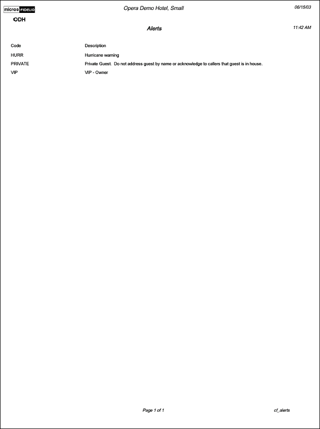 The Configuration report for Alerts will display all Alert types that have been configured for your property.  The ALERTS function must be active to use this functionality.   Alerts are attached to reservations to display based on the Area selection of either at Check In, Check Out or when a Reservation is created.