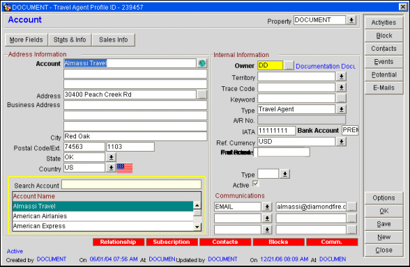 Active. Select this check box if the account is active (this is the default). To make the account inactive, un-select the check box. It is usually preferable to make an account inactive rather than deleting it (by selecting the Delete button from the Profile Options menu). You cannot delete an account that has "child records" (for example, active contacts or business blocks). See Deleting an Account for details.