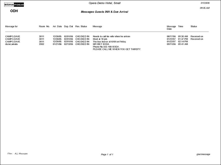 The Messages for Guests in House and Due Arrivals Report can be run during downtimes so messages can be relayed to all guests due in or in house. The user can filter on message status so they do not have to print messages that have already been received.