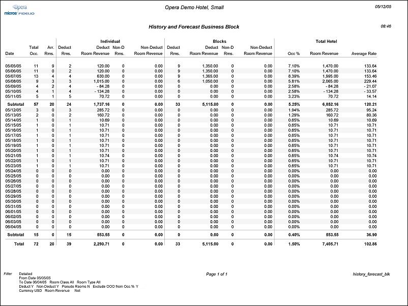 The History and Forecast Business Block Report gives you a clear picture of past reservation activity as well as what reservations are anticipated into the future, broken down into Individual versus Block Business. The report output is divided into Statistical data and Forecast data. The output will match that of the history_forecast.rep with a further additional breakdown of Revenues and Rooms.