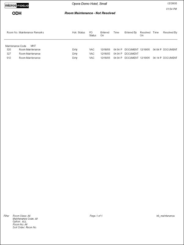The Room Maintenance Not Resolved Report displays the all maintenance requests or work orders on rooms that are resolved as well as unresolved. Print this report to have a record of work orders that need to be fulfilled for the day or week.