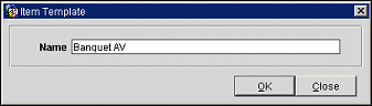 To create a new item template, or modify an existing one, select either New or Edit from the Item Templates grid. The Item Template name screen displays. Enter the name for the template to be created. Generally, this name should reflect the same concept of the items it contains. For instance, if you are creating a template with audio visual supplies for a banquet, you might name your template Banquet AV or something similar.
