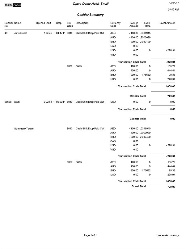 The Cashier Summary Report displays each cashier's total intake, currency for the day, credit cards, and other - prepaid commissions and manual credit cards. This report serves as a cash reconciliation report, and is useful if interfaces are inoperative.