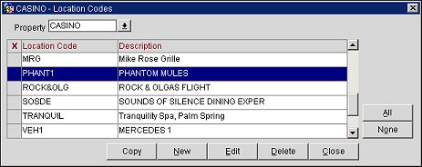 To copy location codes to other properties, select the location codes you want to copy by clicking in the X column to mark your choices (you may also use the All and None buttons), and then select the Copy button. The Properties LOV appears. Select the properties to copy locations to and select the OK button.