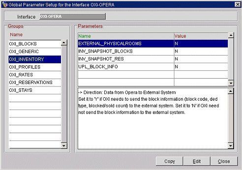 -> Direction: Data from external system to OPERA. If blocks are not transmitted both ways in this interface but the external system creates blocks that affect its inventory, this parameter should be set to Y. In this case block inventory will be updated in the ORS inventory tables from the inventory snapshot sent by external system. Set this parameter to N if it is not necessary to update the ORS block inventory from the snapshot. This would be the case if blocks are transmitted fully both ways, or if the external system does not create any blocks at all. |