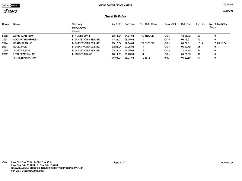The Guest Birthday Report displays all guest profiles that have a birth date entered. The report includes information on stay history, VIP status and the next scheduled reservation. This report can be printed on a weekly basis to determine which Arriving guests have a birthday. Employee profiles are not included in this report.