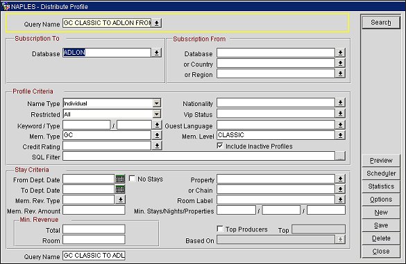 Statistics. Selecting this button displays the status of the pending queue for the profiles to be distributed and subscribed. When the subscription process is complete, the Query Name remains on the screen for reference. (See the Options Screen Description below for more information on the Subscription button.)