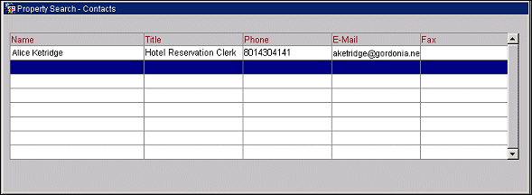 The Property Search - Contacts screen appears when you select the Contacts tab on the Sales Screen's Properties display. The Property Search - Contacts screen provides a list of the employees who have been designated as contacts for the property that is currently highlighted on the Properties screen.