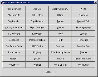 The Reservation Options menu is accessible from the Reservation screen,  from the Reservation Search screen, from the Arrivals screen and from the Waitlist screen. Access the Reservation Options screen by selecting the Options button from any of these screens.