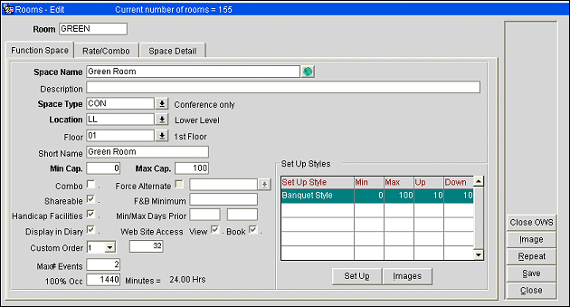 Images. Go to the Meeting Room Images screen to add images of this function space in various setup styles. These images will be available for viewing from the Function Diary. See Function Space Images for details.