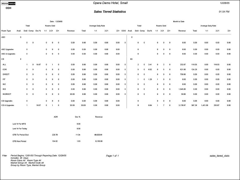 The Sales Tiered Statistics report will display a breakdown of the Room Nights, Room Revenue, and ADR by guest Length of Stay.  If the function RATE TIERS is not active, the Length of Stay groupings will be 1-4, 5-11, 12-29, and 30+ days.  When RATE TIERS is active, the report will use the Lengths of Stay configured by the Property in Configuration->Rate Management>Rate Classifications>Rate Tiers.  The report has only enough room to display three LOS tiers. The first column will display the date range of Tier 1 and the Third column will display the Date Range for Tier 3.  The middle column is a combination of the remaining configured tiers. If only two Length of Stay tiers are configured the third Tier column will not display.