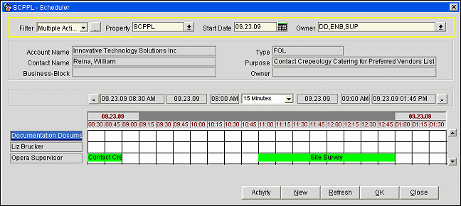 Owner. A multi-pick box where you can choose owners to search for their activities. If you are accessing the Scheduler from the main Activities menu, this will default to the person who logged on.  If you are accessing the Scheduler from the Activities Search screen, the Owners that have been chosen in this screen will be passed to the Scheduler search criteria. When left empty, only those employees that have owner initial assigned to them will be shown.